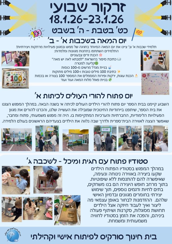 תוכנית "א' תחילה" – תלמידי א' נקלטים במרחבים המעוצבים מחדש, סביבת למידה המזמנת התנסות במיומנויות של לומדים.ות עצמאיים.ות ומאפשרת למידה פעילה וחווייתית.