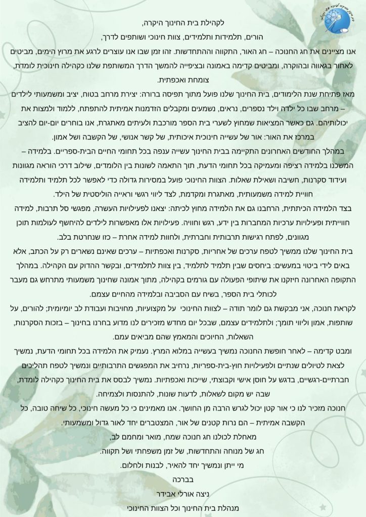 ולכם על שיתוף הפעולה בביצוע הבדיקות לילדים, ערב פתיחת שנת הלימודים, על מנת שנוכל לפתוח את שנת הלימודים בהצלחה.