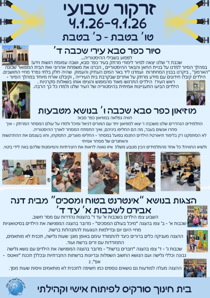 שעה שבועית במערכת– "הכוחות שבי" בשעה זו ניתנת במה אישית לחוזקות ופיתוח מטרות אישיות- את הצוות מלווה הפסיכולוגית אפרת מעיין.